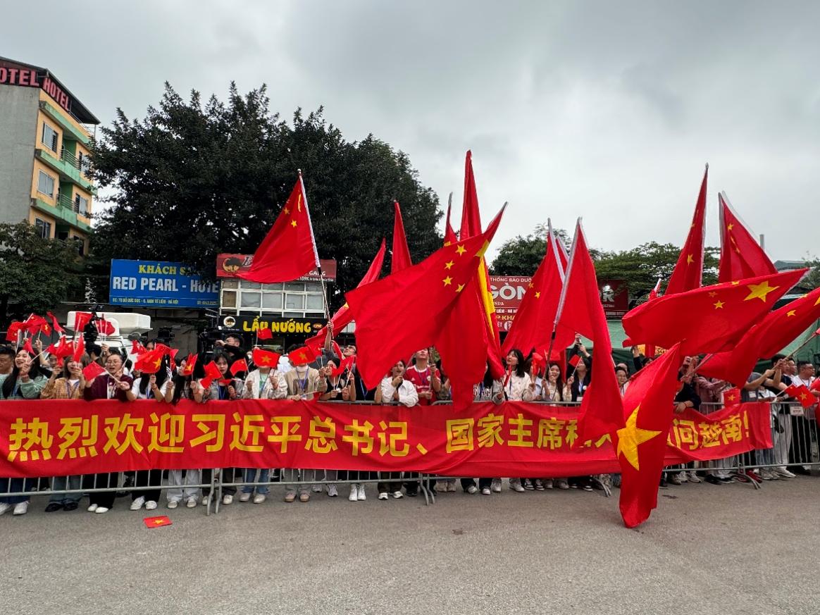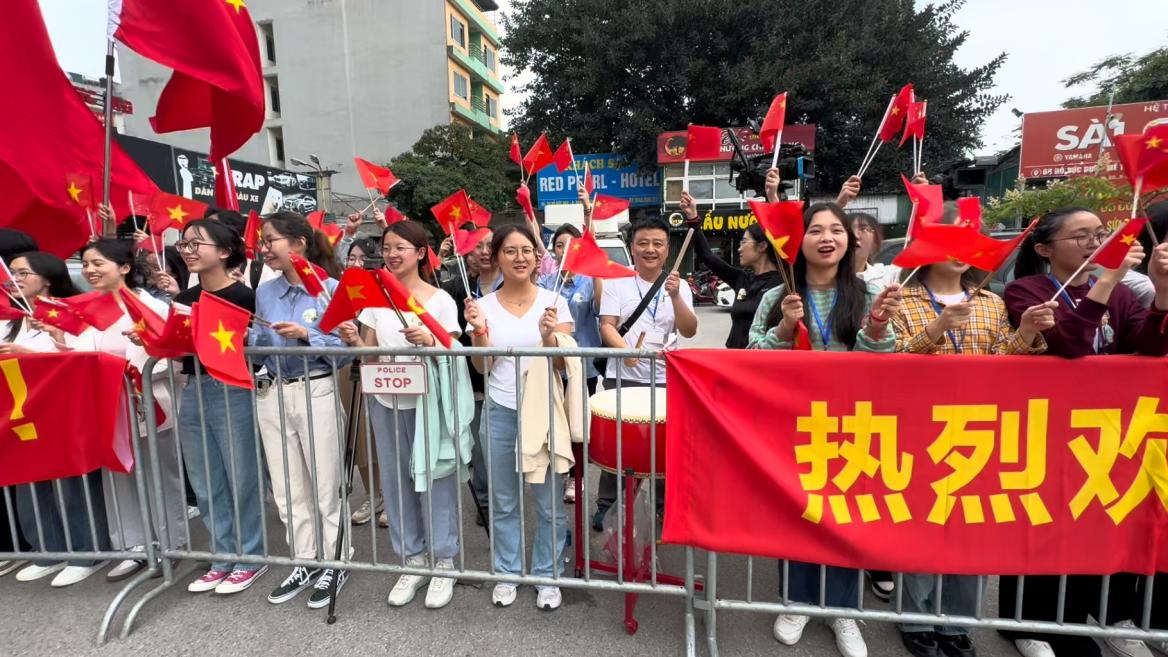 12日中午,五星红旗与金星红旗飘扬在河内的街头,在越中国学子的脸上洋溢着热情的笑容,手中挥舞着两国旗帜,热烈欢迎习近平总书记的到来。