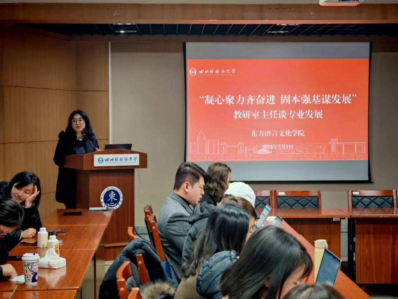 落实立德树人根本任务,提高人才培养质量加强学科专业建设探索创新基层教学组织形式积极响应学校“深化改革年”部署安排,东方语言文化学院于2024年3月1日下午1点在立德楼C216召开“凝心聚力齐奋进、固本强基谋发展——教研室主任谈发展”主题研讨会。罗文青院长、廖礼彬书记、陈睿副书记、吴昊副院长、全体教职员工参加了本次研讨会议由院长助理朴春兰老师主持。