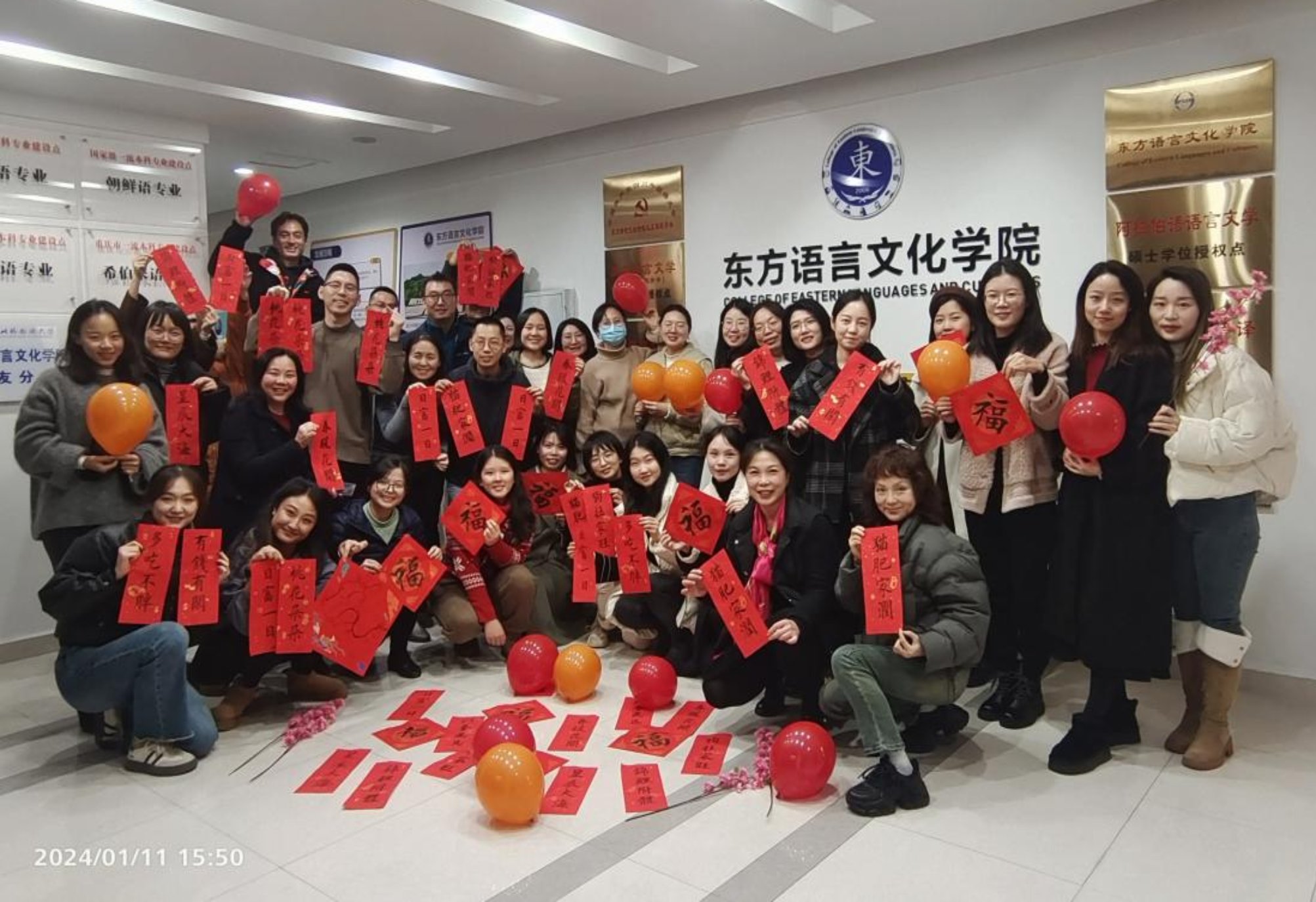 冬雪初融,万象更新,2024年1月11日下午,立德楼C216翰墨飘香喜气洋洋。东方语言文化学院的老师们欢聚一堂,共庆佳节,一场“笔墨凝书香,迎春送万福”联欢活动正有序进行。